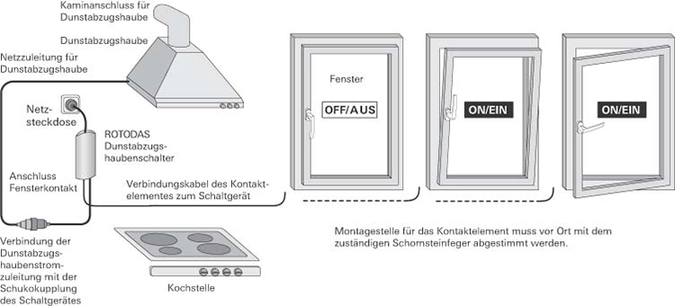 Die automatische Dunstabzugshaubensteuerung sorgt für vorschriftsgemäßen Betrieb in Verbindung mit offenen Feuerstellen wie Kaminen oder Gasheizungen. Sie schaltet die Stromzufuhr nur bei geöffnetem Fenster frei und verhindert so eine potenzielle Erstickungsgefahr durch Kohlenmonoxid – für mehr Sicherheit in Ihrem Zuhause.